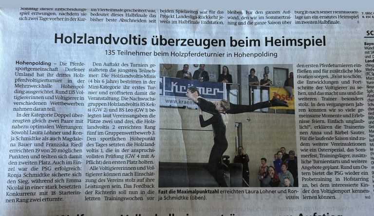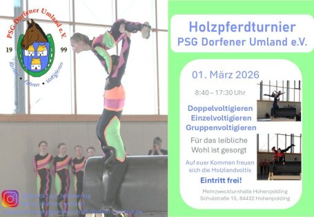 In diesem Jahr veranstalten wir unser erstes Holzpferdvoltigierturnier. Am 25.02.2024 zeigen unsere Voltigierer was sie können und auch andere Vereine und Voltigierer sind herzlich eingeladen den Tag mit uns gemeinsam zu etwas besonderem zu machen. Alle Infos rund ums Turnier findet ihr in der Ausschreibung.